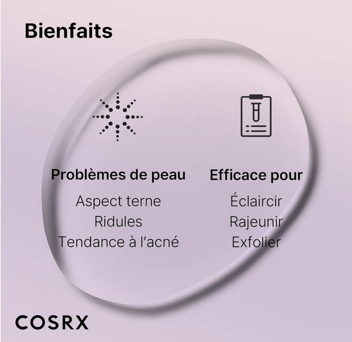 Mettez du produit sur un coton après le nettoyage et passez-le sur le visage. Évitez le contour de la bouche et des yeux. Si vous utilisez le gommage le matin, appliquez ensuite une protection solaire avec écran de protection SPF 30 ou plus.